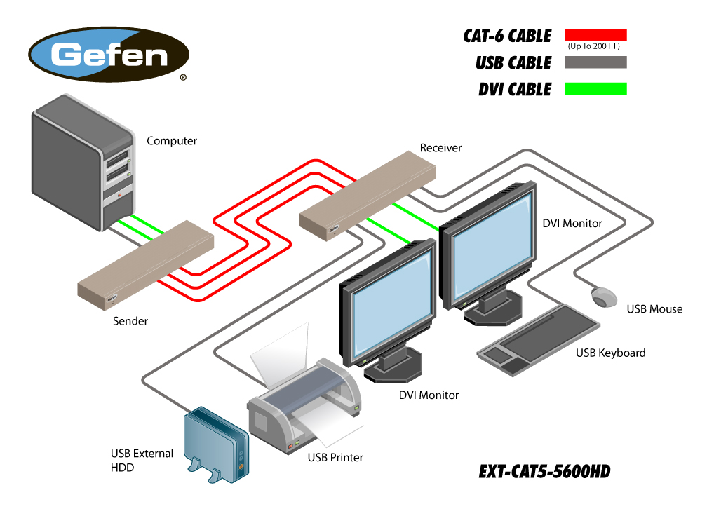 KVM удлинитель Gefen EXT-CAT5-5600HD, комплект устройств состоящий из приемника и передатчика, для передачи двух видео каналов DVI-D Single Link и интерфейсов USB 2.0, по трем витым парам (CAT-5е, CAT-6).