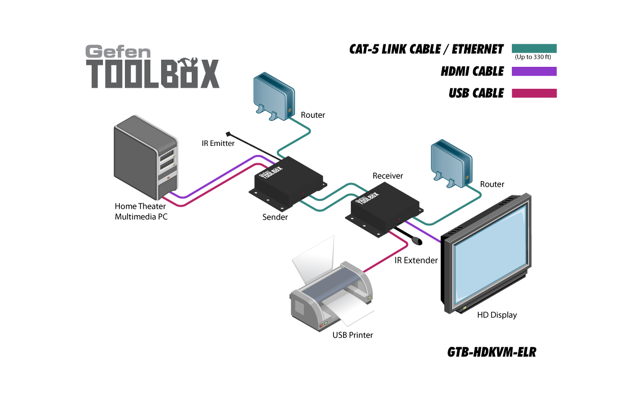 GefenToolBox HDKVM ELR предназначен для удлинения сигналов HDMI, USB 2.0, Ethernet, и ИК на расстояние до 100 метров. Блок приемника позволяет подключать HDMI и два устройства USB, обеспечивая доступ к принтерам, сканерам, фотоаппаратам, внешним жестким дискам и т.д. В GTB-HDKVM-ELR использует Gefen ELR (Extra Long Range) технологии, поддерживая спецификации HDBaseT ®, что позволяет передачу HDMI и ИК сигналов по тем же кабелям витой пары CAT-5. USB 2.0 передается по второй витой паре CAT-5. Прибор поддерживает работу Hi-Def до Ultra HD 4Kx2K (3840 х 2160 @ 30 Гц), 1080p Full HD, и 1920 х 1200 (WUXGA).